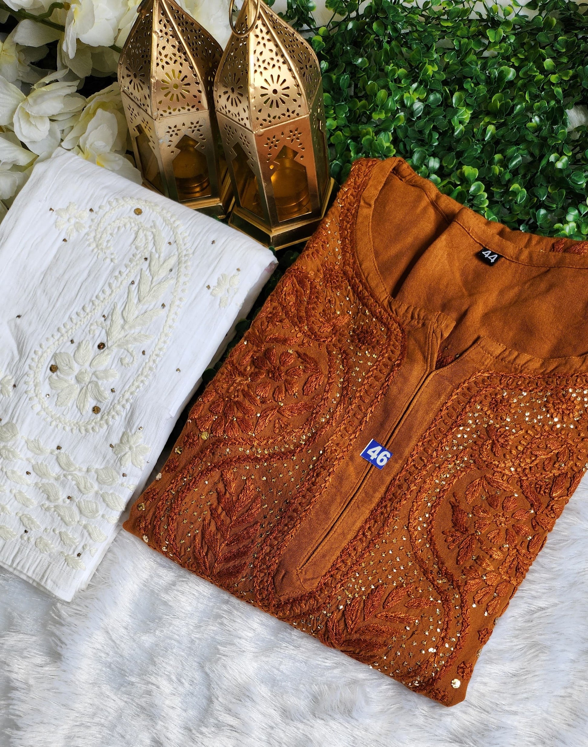 Chikankari is a traditional embroidery style from Lucknow, India, known for its intricate and delicate hand-embroidered patterns. Combining this craftsmanship with Mukesh work on a Rayon fabric kurta can result in a stunning piece of clothing that blends traditional art with modern fabric choices.