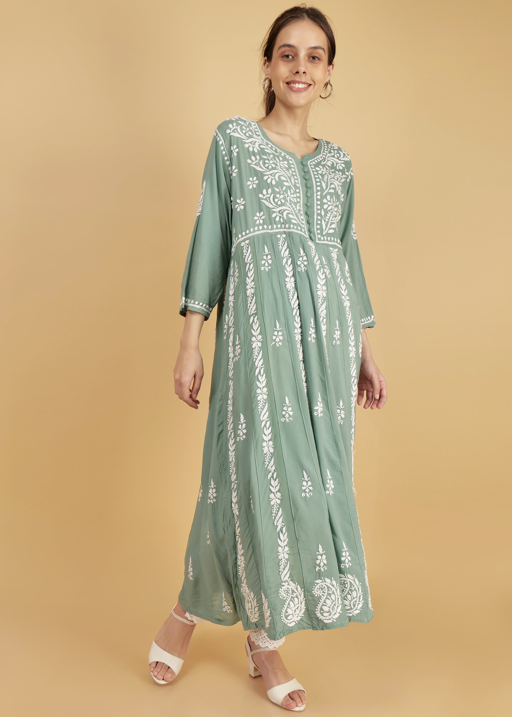 A Pure Modal Hand-Embroidered Anarkali Kurta is a type of traditional Indian outfit known for its long, flowy silhouette and intricate hand embroidery. Pure modal indicates that the kurta is made entirely from modal fibers without any blend of other materials, It's known for its softness, smooth texture, and excellent drape.Hand embroidery involves intricate designs and patterns that are stitched onto the fabric using needles and thread,