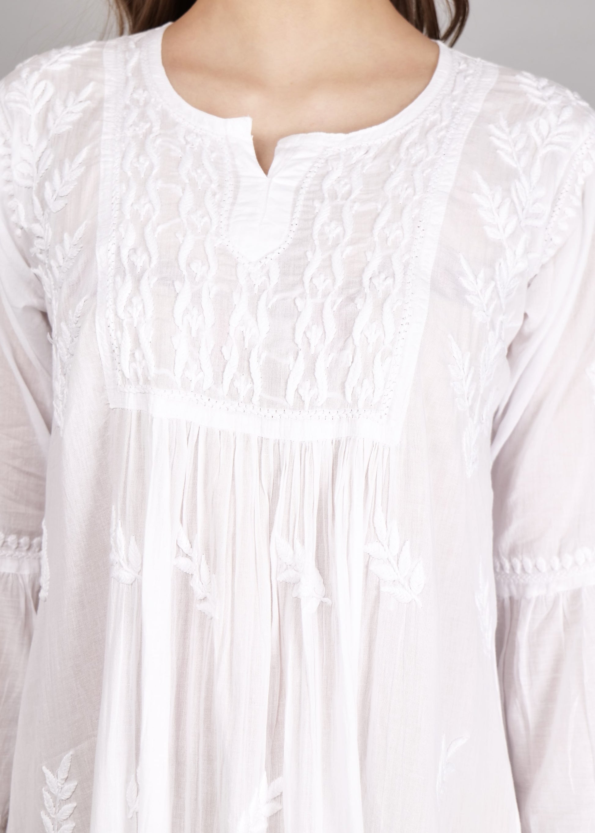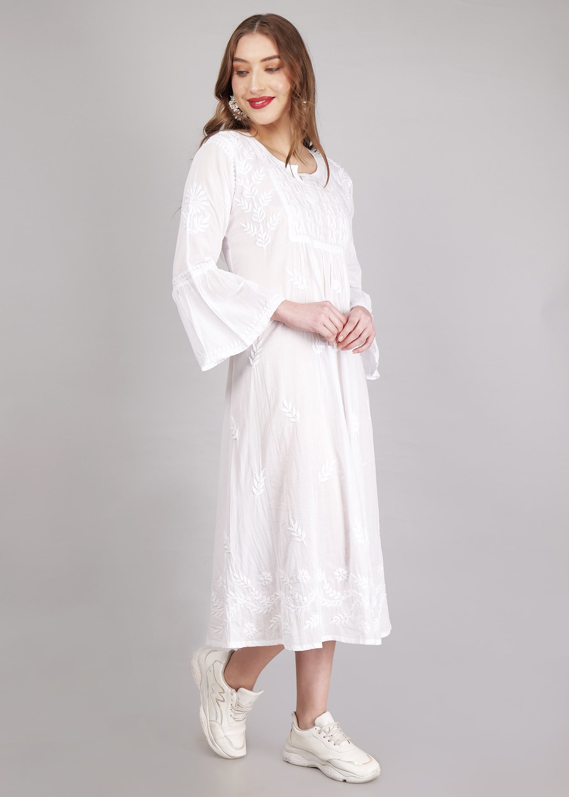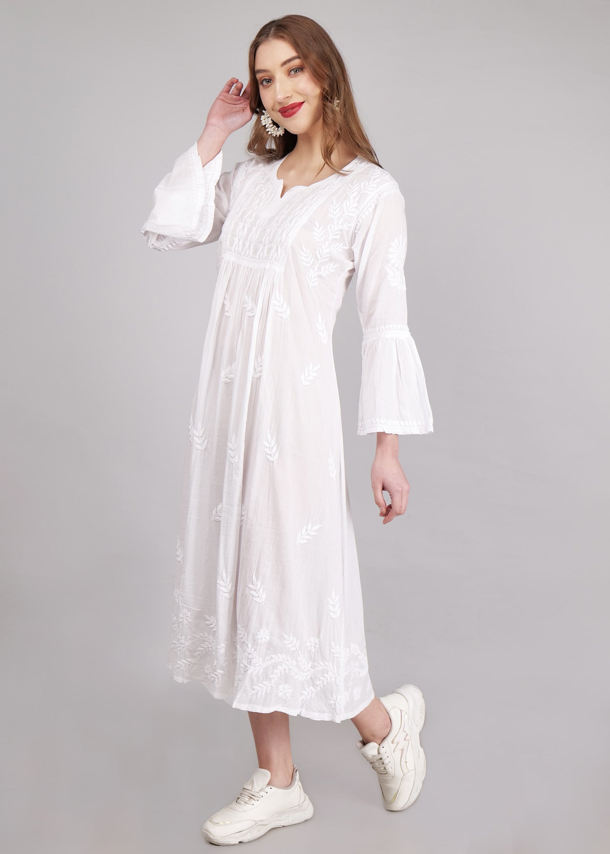 A knee-length mulmul chikankari dress is a garment that combines traditional Indian embroidery.