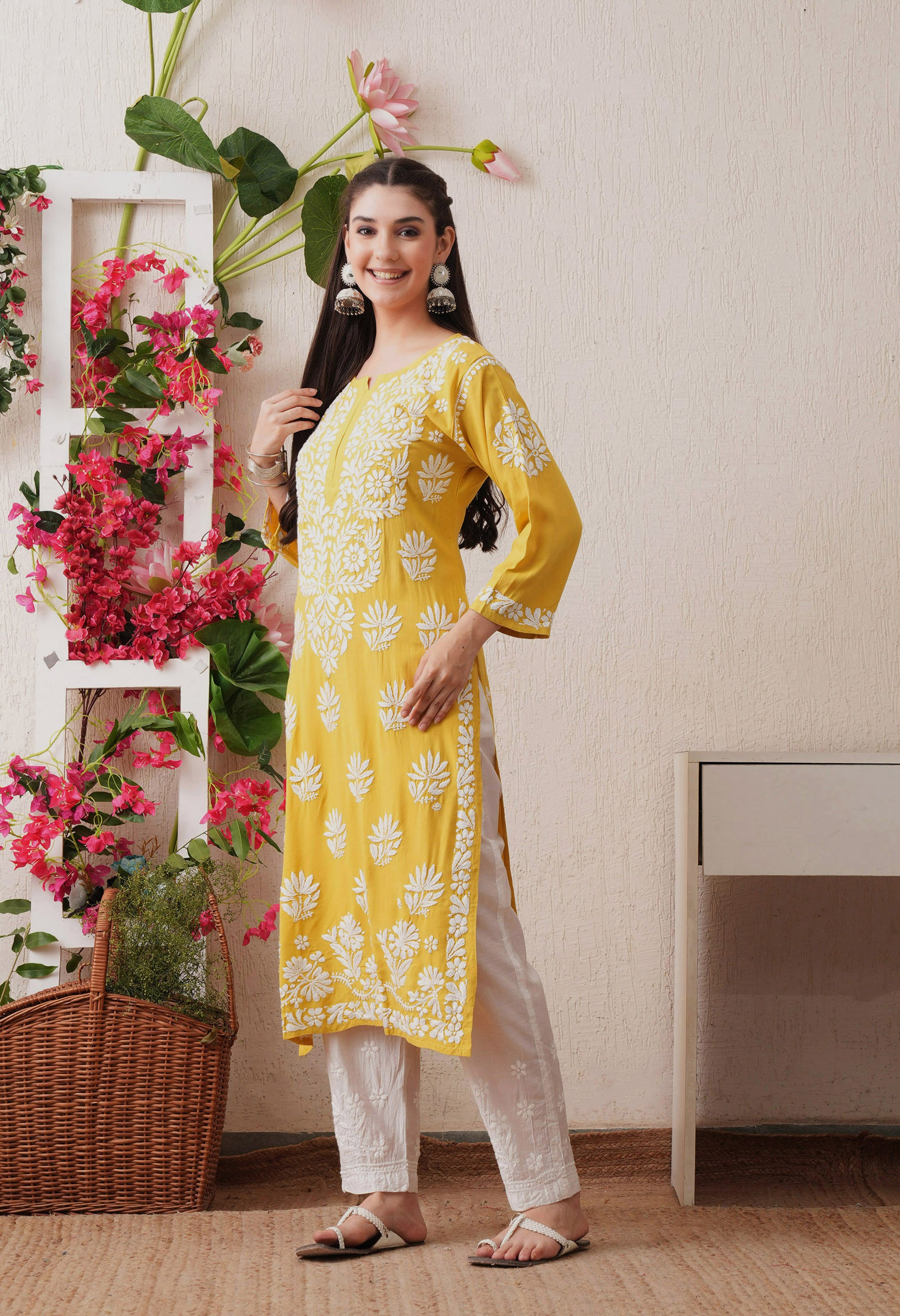 Add a touch of Lucknow’s timeless elegance to your wardrobe with this rayon straight kurta. Beautifully adorned with intricate white chikankari embroidery, this piece blends tradition with modern comfort. The breathable rayon fabric makes it perfect for all-day wear, while the straight silhouette flatters every body type. Pair it with palazzos or leggings for a graceful ethnic look that’s ideal for casual outings, festive gatherings, or office wear.