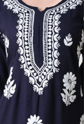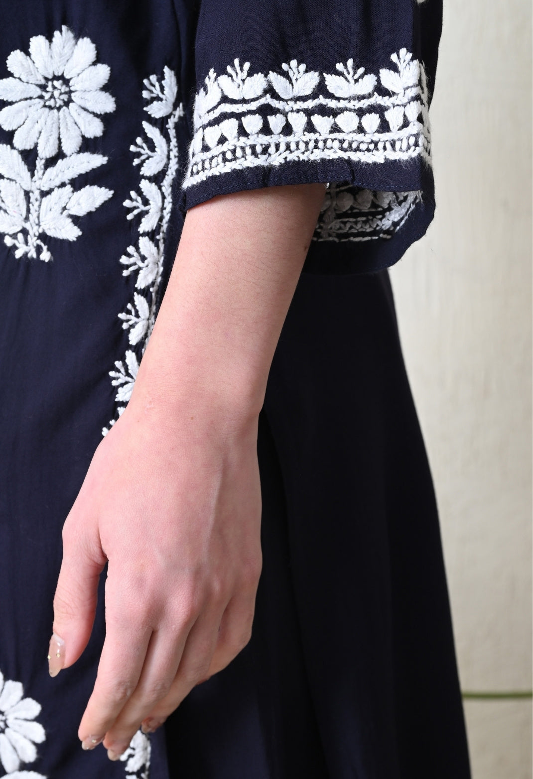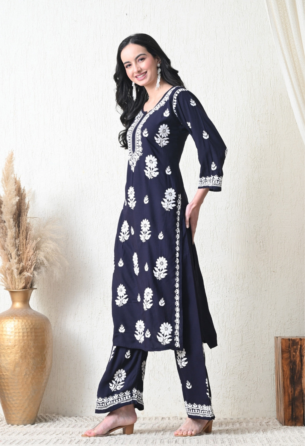 Navy Blue Rayon Hand Embroidered Chikankari Kurta & PLazo Set with Floral Motifs