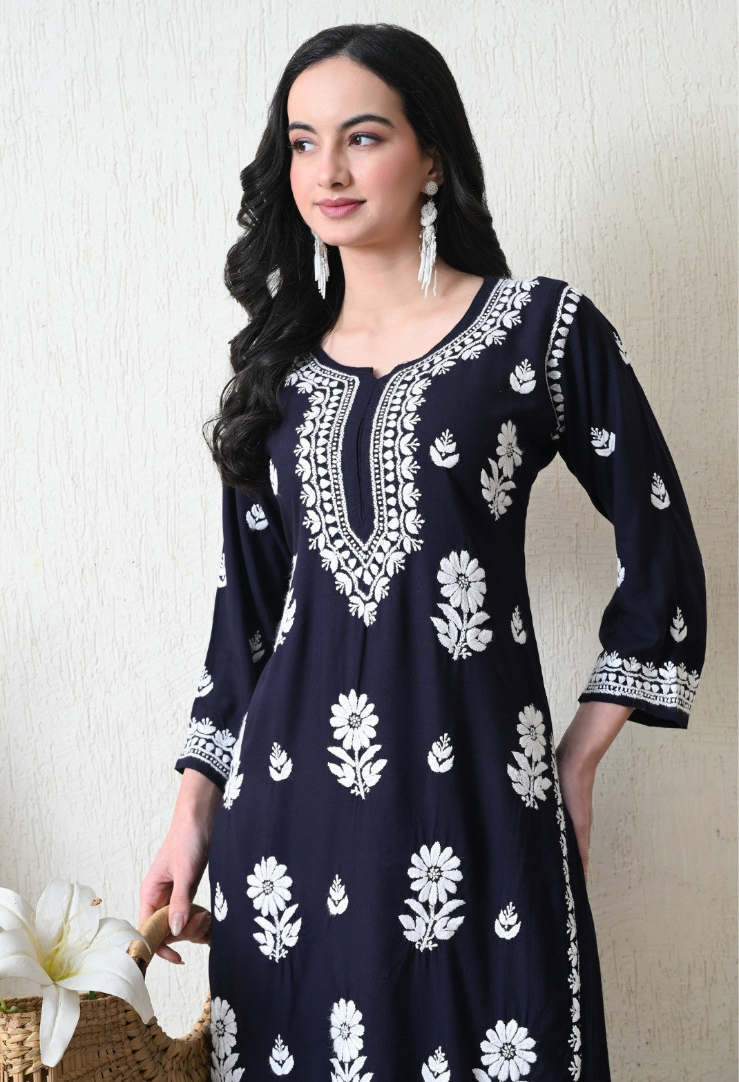 Add timeless elegance to your wardrobe with this stunning navy blue rayon chikankari kurta set, featuring delicate hand-embroidered floral motifs.