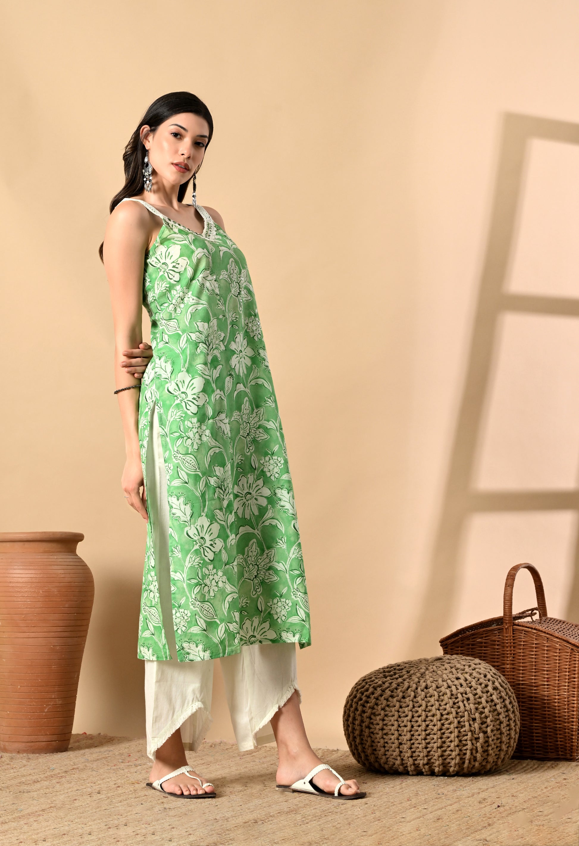 Elevate your ethnic wardrobe with this elegant 3-piece cotton set featuring a trendy noodle strap kurti, a stylish fish cut palazzo, and a matching dupatta. Crafted from breathable, high-quality cotton, this set is adorned with delicate sitara (sequin) work, adding a subtle sparkle perfect for festive occasions or casual outings. The noodle strap kurti lends a modern touch, while the palazzo's unique fish cut silhouette offers graceful movement and a flattering fit. Whether you're attending a daytime event or a casual evening gathering, this ensemble promises both comfort and charm.