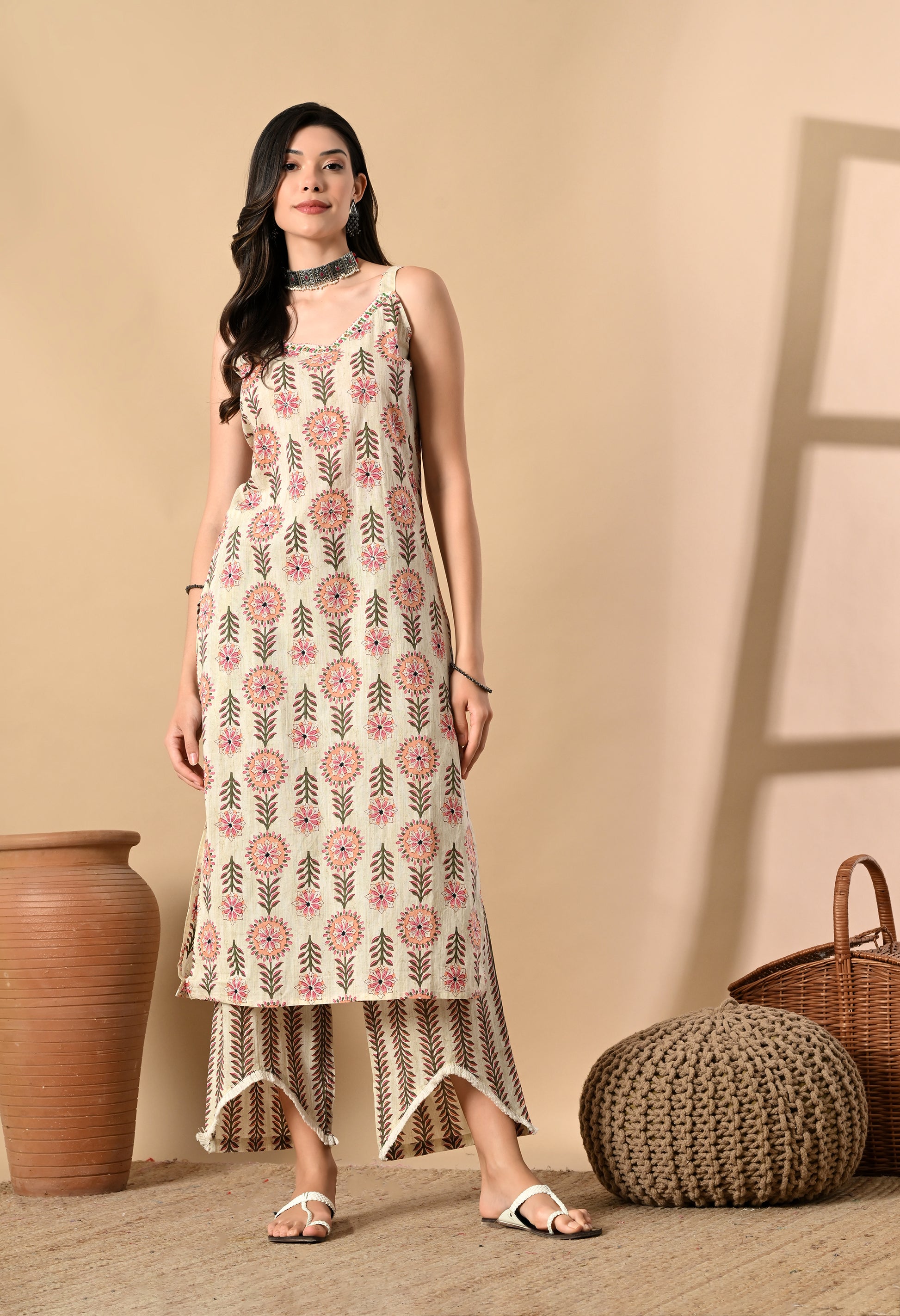 Noodle Strap 3PC Cotton Set with Fish Cut Palazzo and Sitara Work