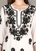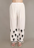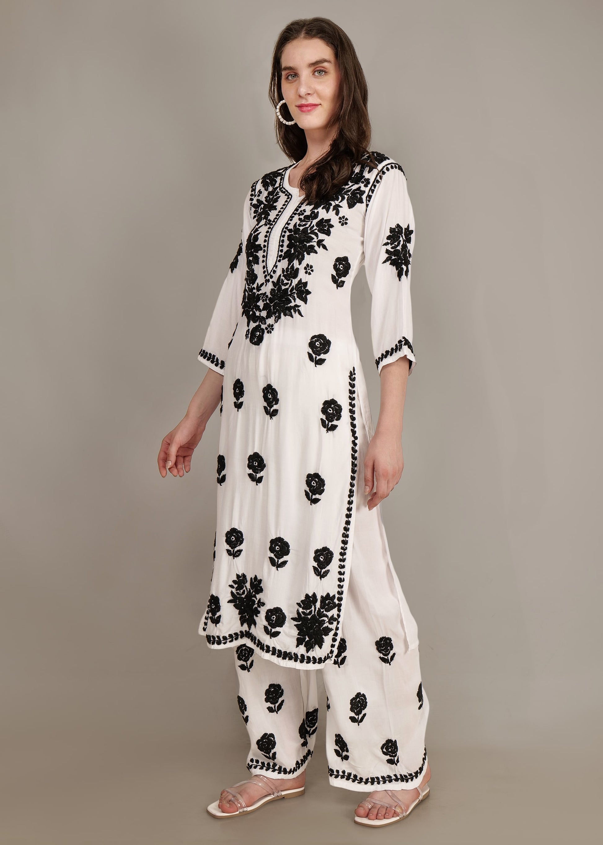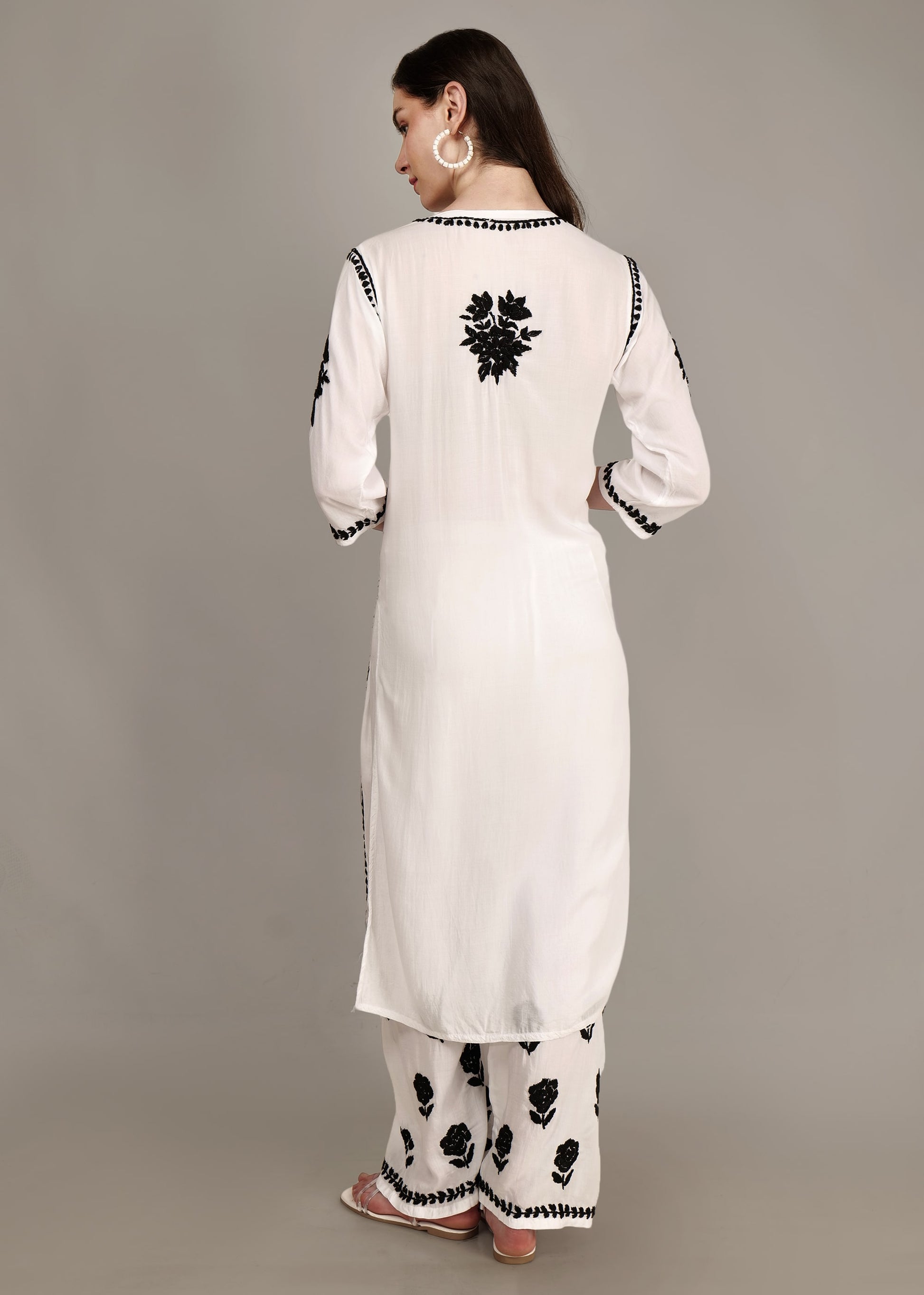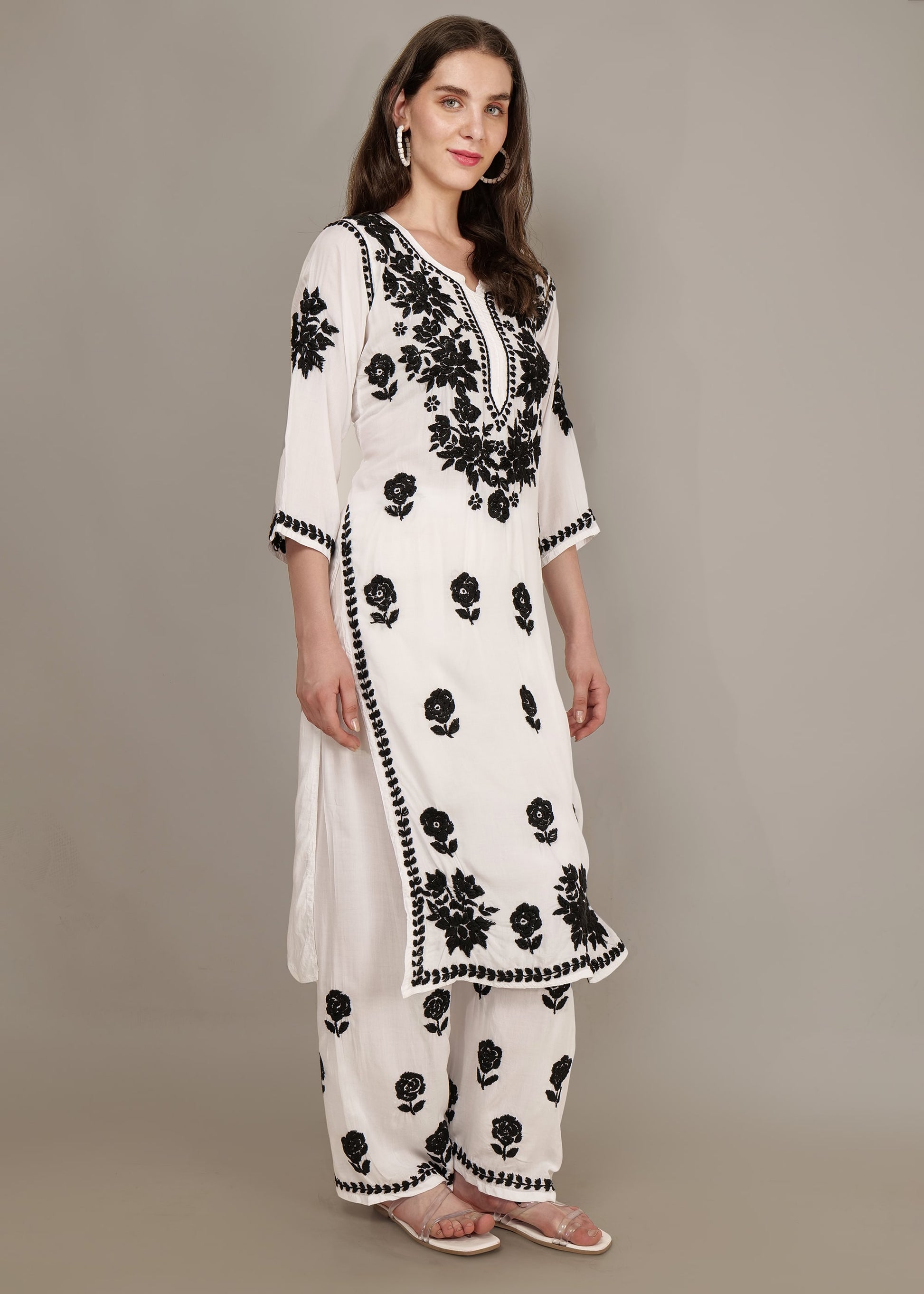 A Modal White base and Black Hand-Embroidered Lucknow Chikankari Palazzo set is a stylish and elegant outfit that combines the traditional Lucknowi Chikankari embroidery technique with modern design elements.The base color of the outfit is white, which is a classic choice for Lucknowi Chikankari embroidery. This color provides a clean and timeless canvas for the intricate hand-embroidered work. The highlight of this set is the hand-embroidered Chikankari work.In this case, black thread is used for embroidery, creating a striking contrast against the white fabric. It involves delicate and intricate white threadwork on a contrasting base fabric.