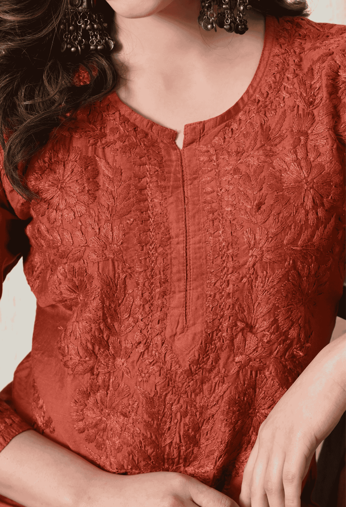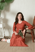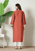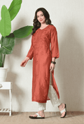 Rust Orange Chanderi Hand Embroidered Chikankari Straight Kurta