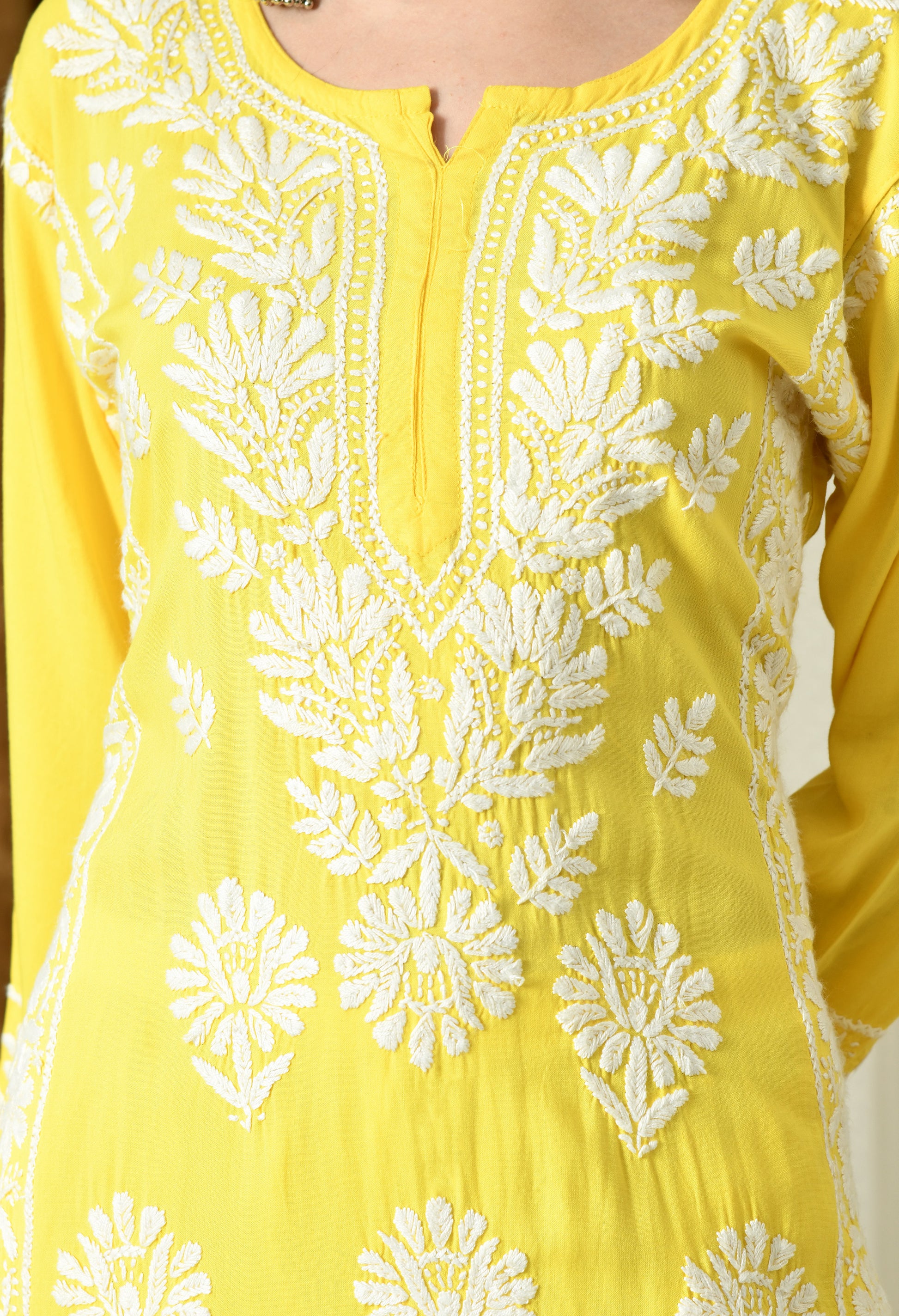 Sunshine Yellow Modal Hand-Embroidered Chikankari Kurta with Elegant White Floral Design