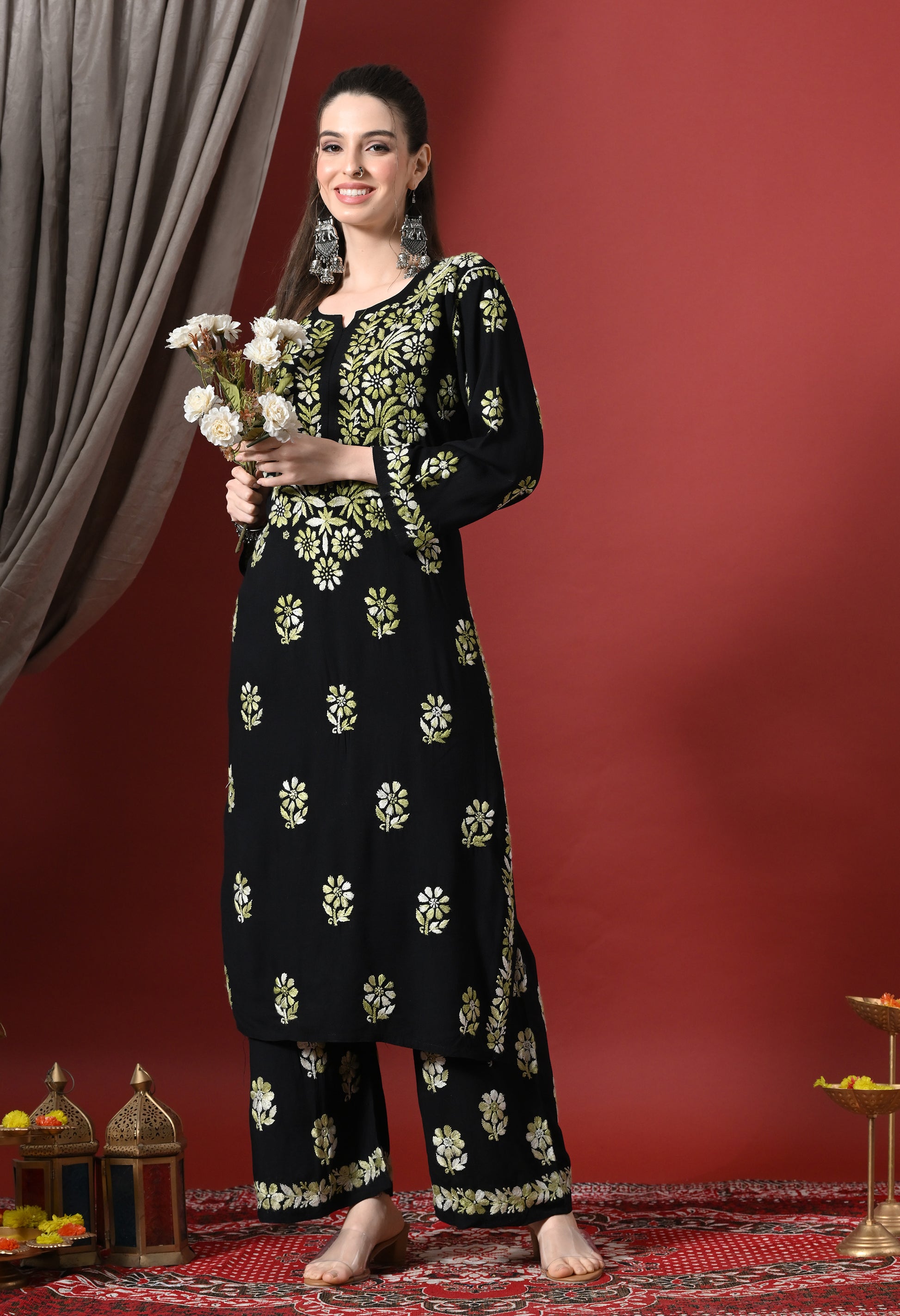 Experience timeless elegance with this Black Rayon Chikankari Kurta & Palazzo Set, crafted with intricate hand-embroidered floral motifs in soothing green and white threads.