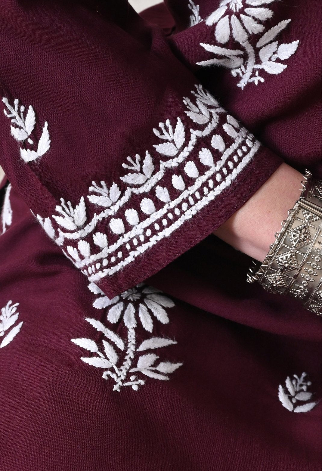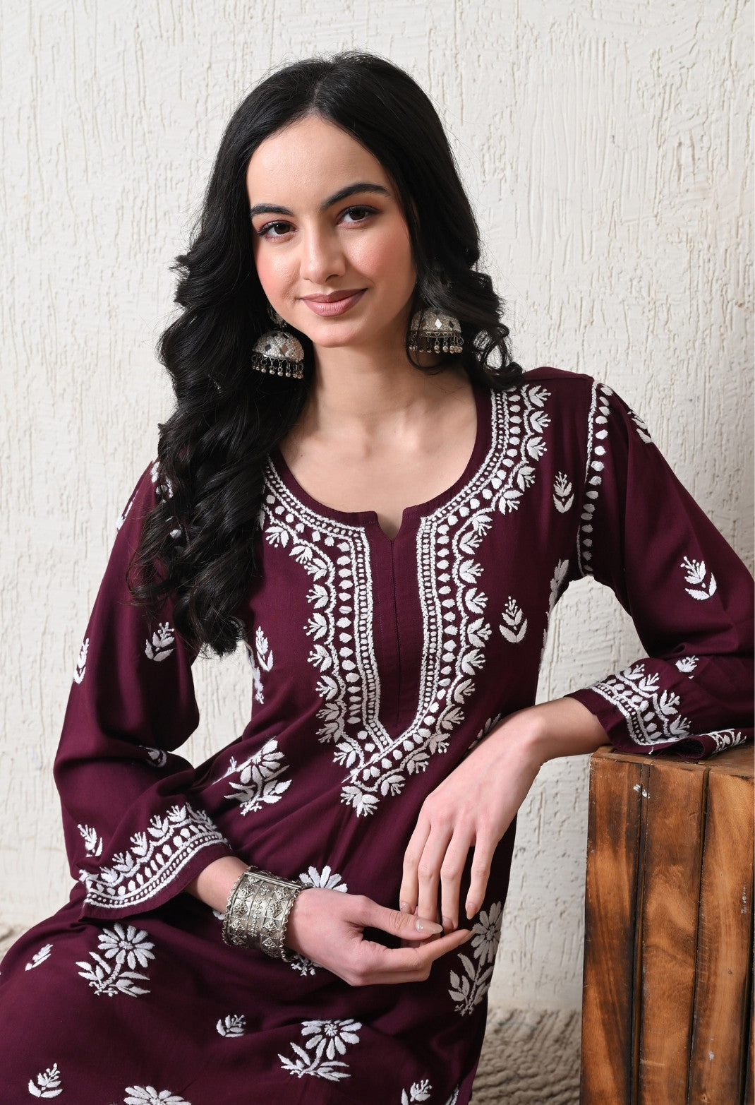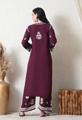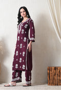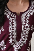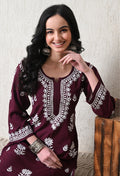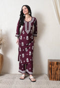 Wine Rayon Hand Embroidered Chikankari Kurta & PLazo Set with Floral Motifs